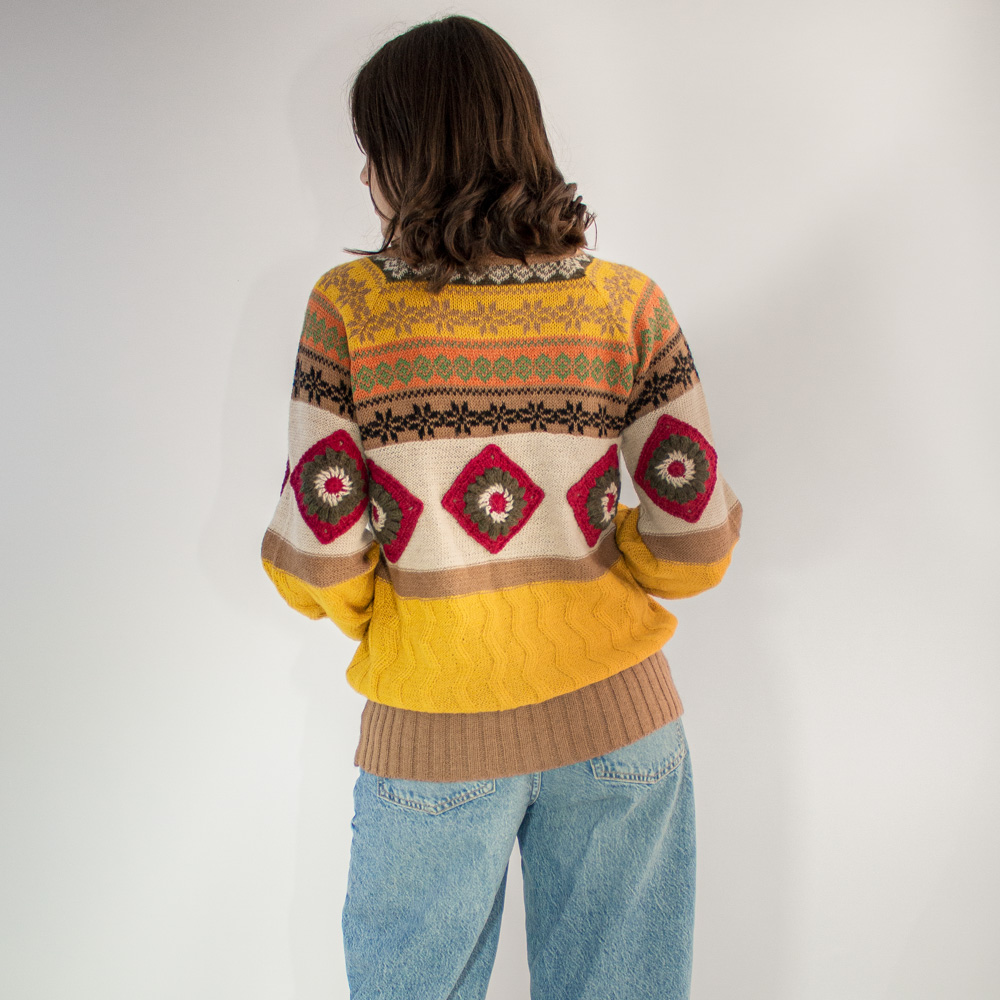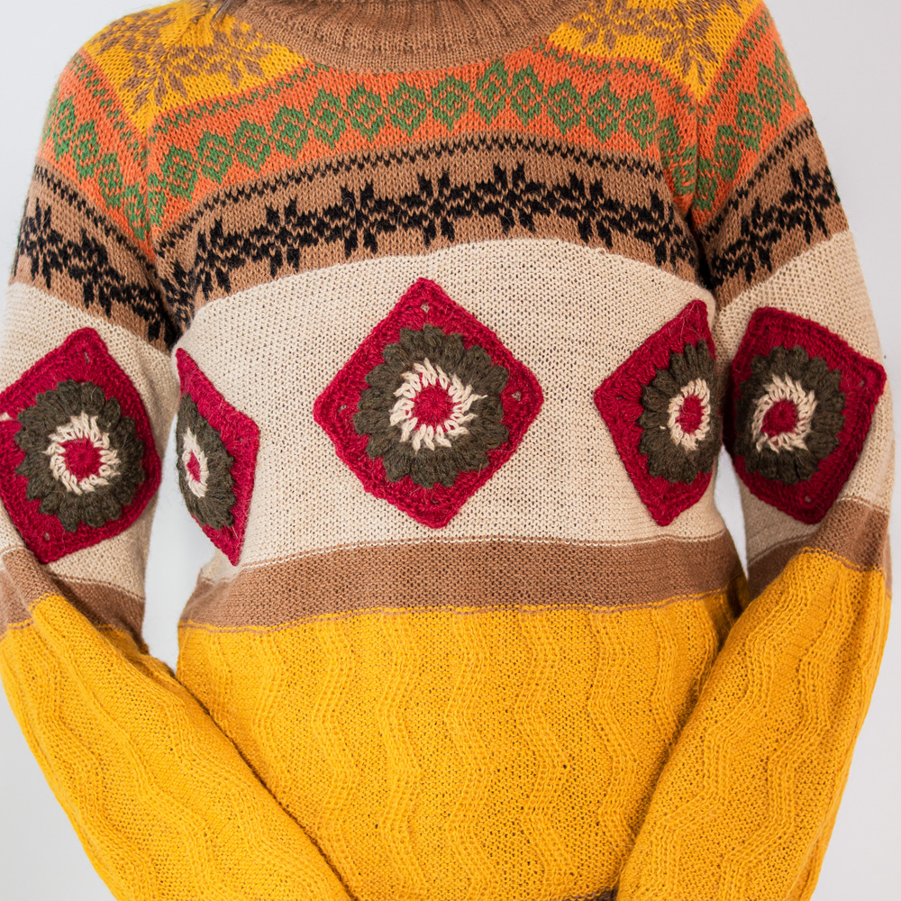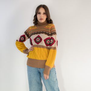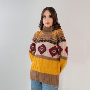 Paqary Suéter, es un prenda de manga larga tipo rangla, con un tejido de cuello alto, con aplicaciones de rombos en cuerpo y mangas que resaltan la prenda, la prenda tiene hasta 8 tipos de tejidos artesanales en una sola prenda. Paqary suéter es único para lucir y resaltar.
